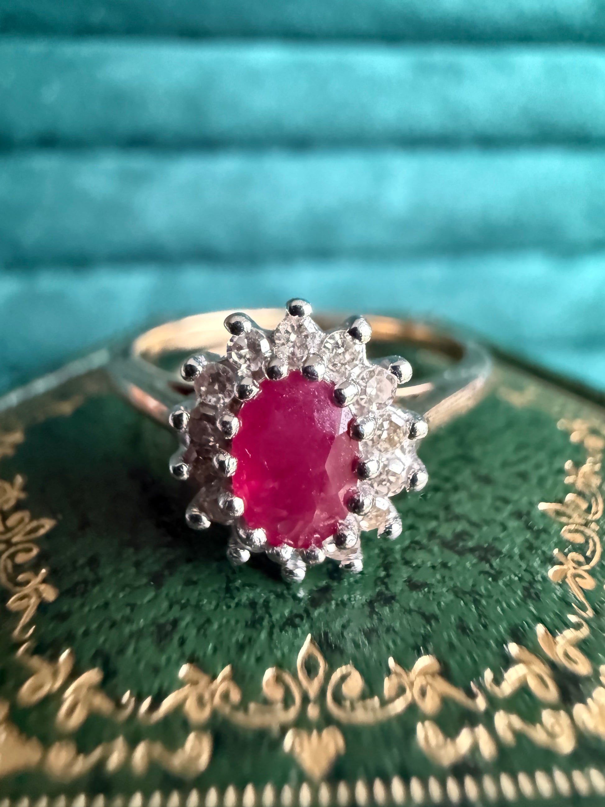 9ct gold ruby and diamond halo ring